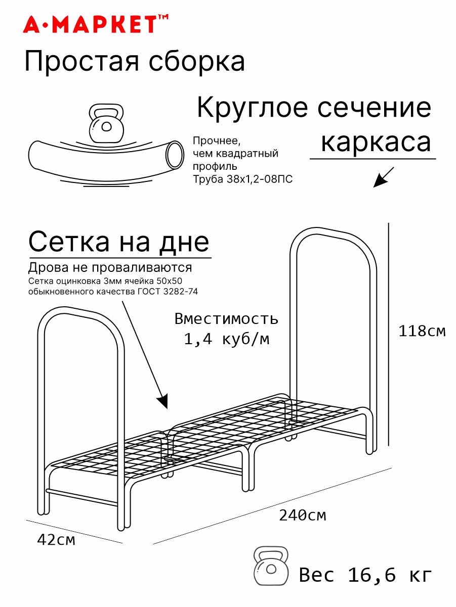 Специальная сетка (оцинковка 3мм ячейка 50*50 ГОСТ 3282-74) позволяет размещать дрова любого размера - они не упадут вниз между трубами. Запас дров хранится не на земле, не соприкасается с влажными поверхностями. Дрова проветриваются с обеих сторон за счет того, что торцы поленницы полностью открыты.