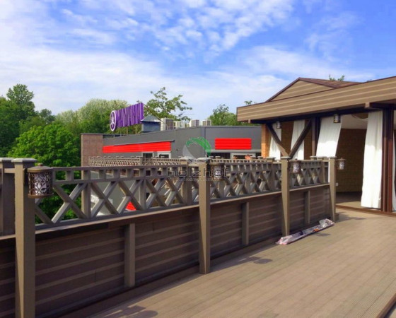 Монтаж был осуществлен бригадой наших монтажников. Все стационарные элементы конструкций, таких как веранда, парапеты, переходы, лестницы столбы и т.п. были обшиты именно террасной доской ДПК Holzhof. Обращаем Ваше внимание, что именно эта доска имеет целый ряд преимуществ для использования ее на коммерческих объектах: