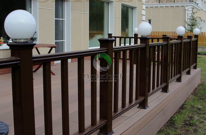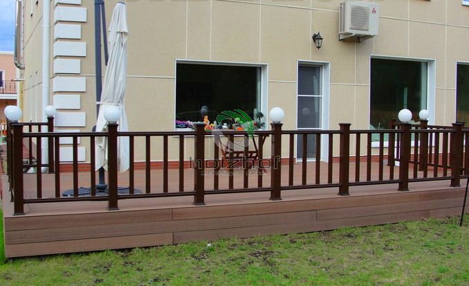 В г. Новосибирске в поселке таунхаусов выполнен монтаж нескольких террас из терасной доски из ДПК Holzhof, а также ограждений Holzhof коричневого цвета. Главной особенностью таких террас было то, что элементы ограждений сделаны с подсветкой. Скрытая проводка, пониженное напряжение до 12 вольт позволило сделать эту зону отдыха комфортной и безопасной.
