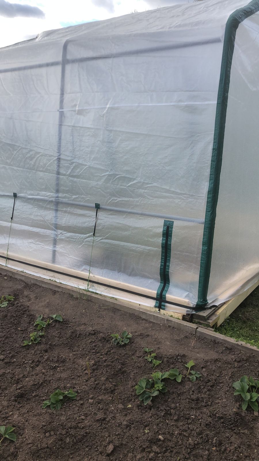 По низу добавлен материал пленки, чтобы чехол доставал до земли. Но все равно мы рекомендуем обустроить низ теплицы фундаментом из бруса или толстой доски, чтобы было к чему крепить и прижимать чехол.